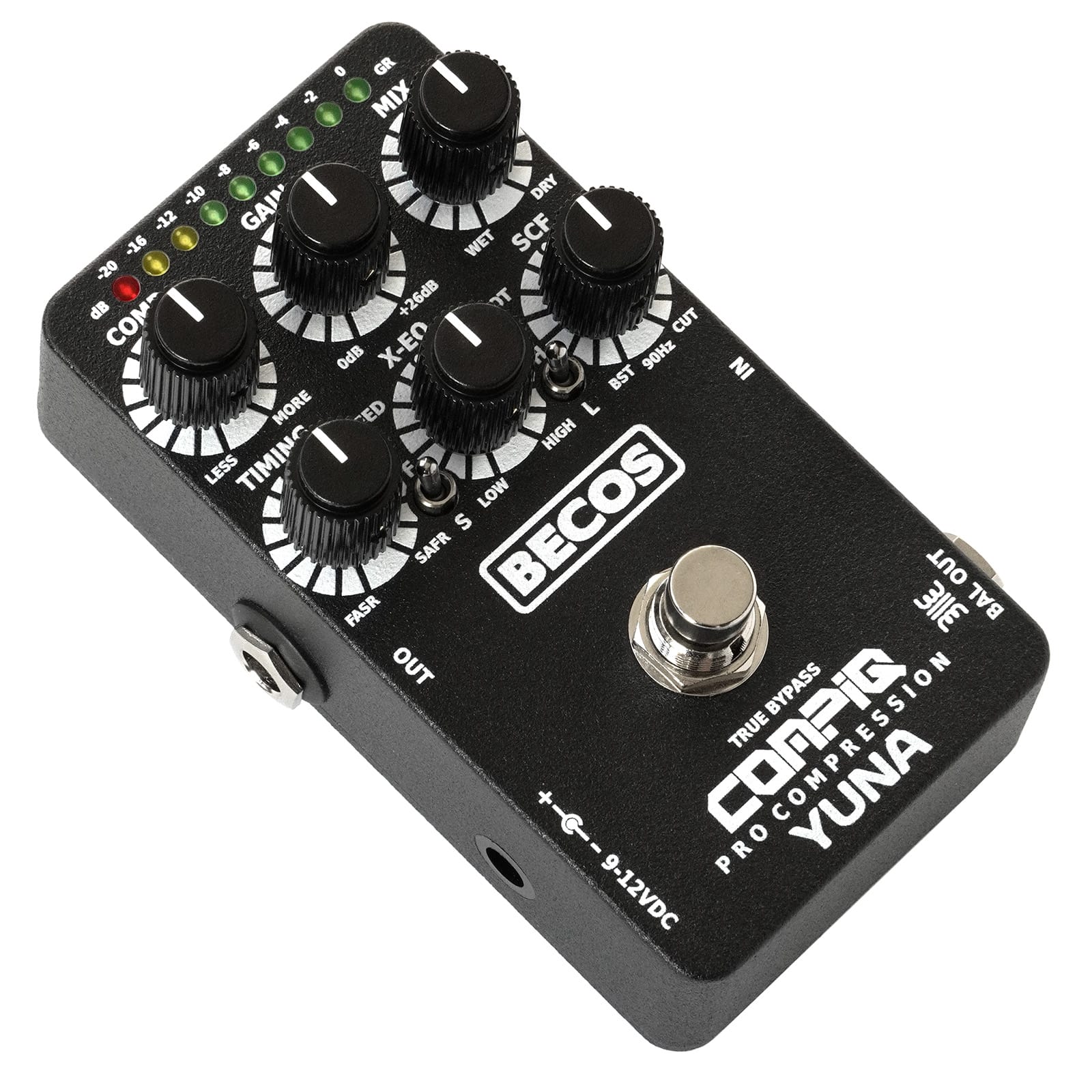 The CompIQ YUNA Pro is a smooth-sounding, powerful all-analog compressor and soft-limiter pedal for guitar, bass, or any other instrument or audio source. It operates on a standard 9V battery or an external 9-12VDC power supply (not included), making it one of the few pedals still offering a battery option. Like all CompIQ series compressors, it’s built with Burr-Brown™ pro audio FET ICs, low-tolerance metal film resistors, and plastic film capacitors in the audio path, for low noise and accurate frequency response. At its core is the THAT Corp’s flagship 4320 Analog Engine®, which combines a true RMS-level detector with a high-performance Blackmer® VCA. Unlike typical peak detectors, the RMS sensor averages the signal level over time, better matching how we perceive loudness. YUNA’s RMS reference level can be set to -10dBu for strong sources like pro line-level gear, -20dBu for standard instrument signals, or -30dBu for low-output pickups such as single-coil guitars.